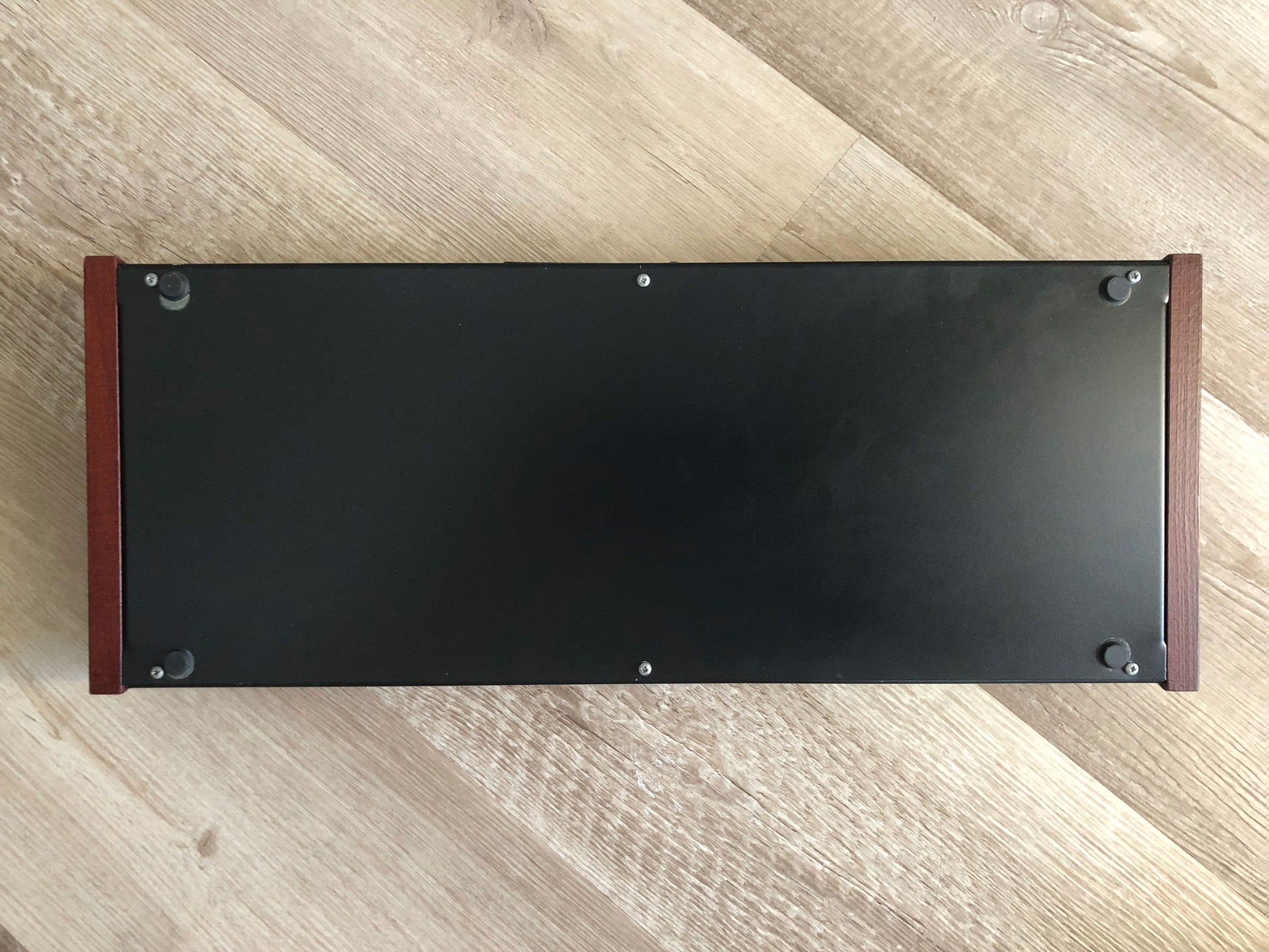 - Physical Design: Black metal chassis with wood end panels; desktop or rack-mount form; approx. 470 × 185 × 75 mm; ~2.85 kg