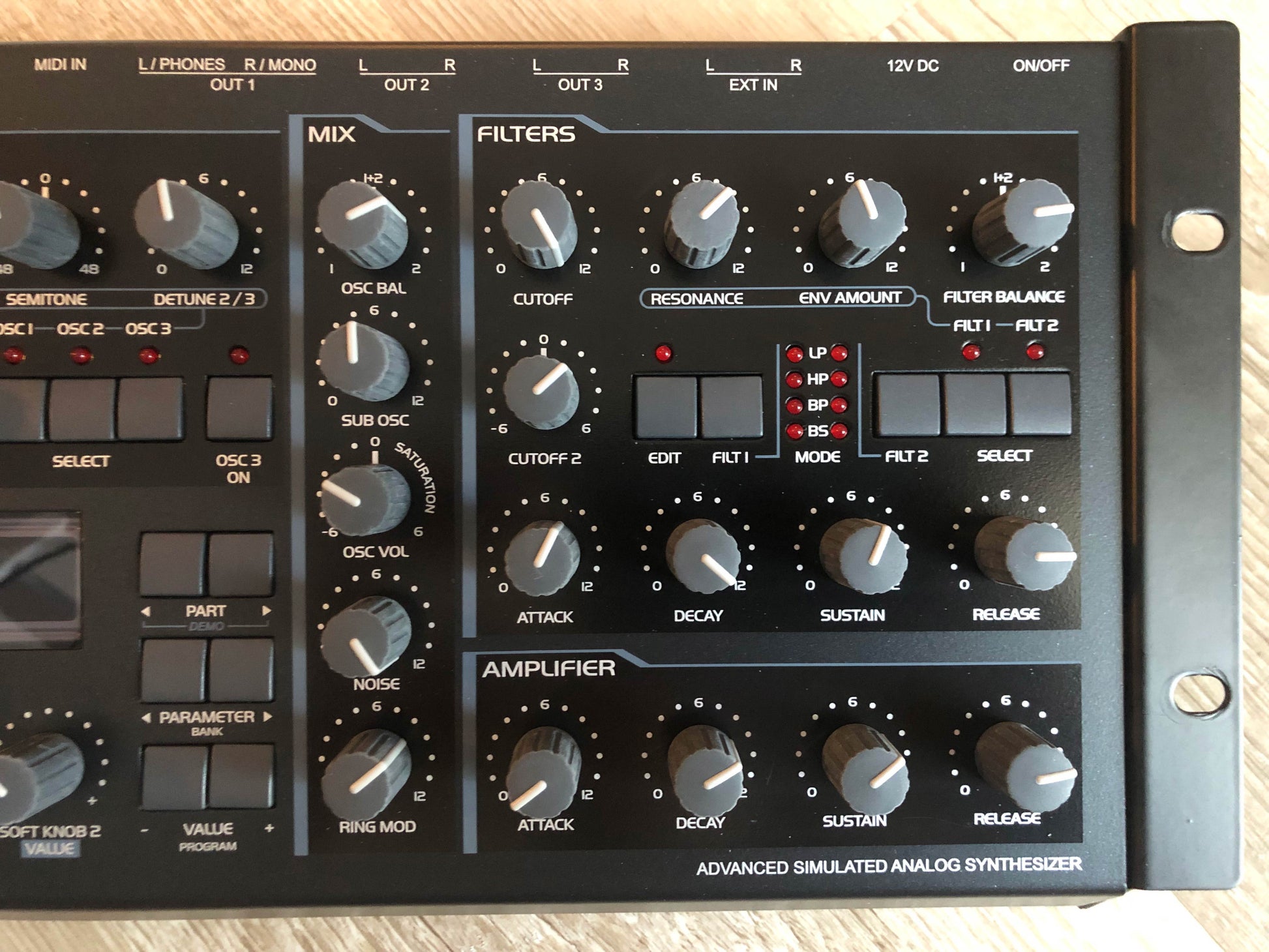 - Features: oscillator sync, ring modulation, FM, sub-osc
