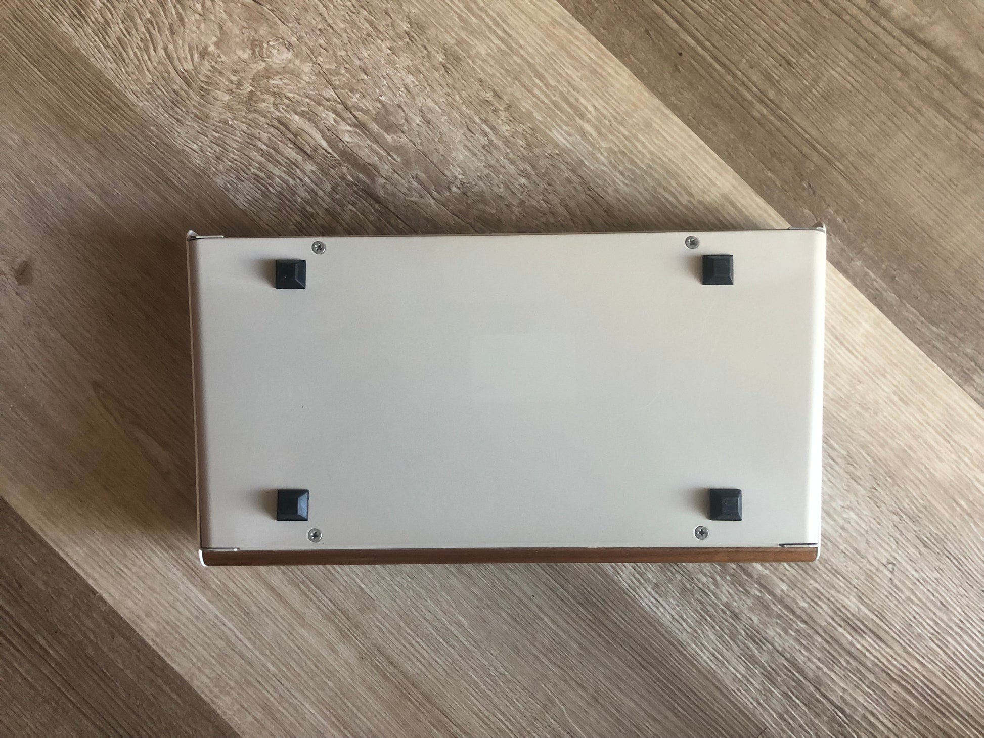 Four new rubber feet have been installed. This unit previously had felt feet attached to the bottom. These were difficult to remove, so there is some loss of "shine" on the bottom panel where they once were. The finish here is otherwise untouched.