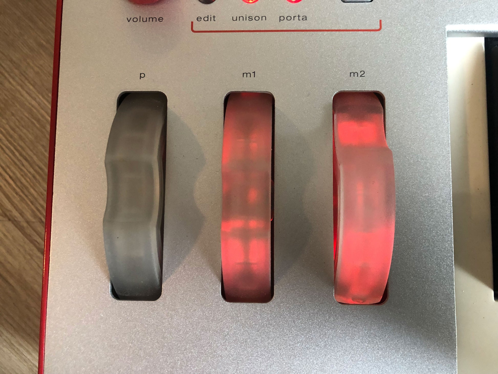 No yellowing of mod wheels or the encoder knob. Volume knob also in very nice shape.