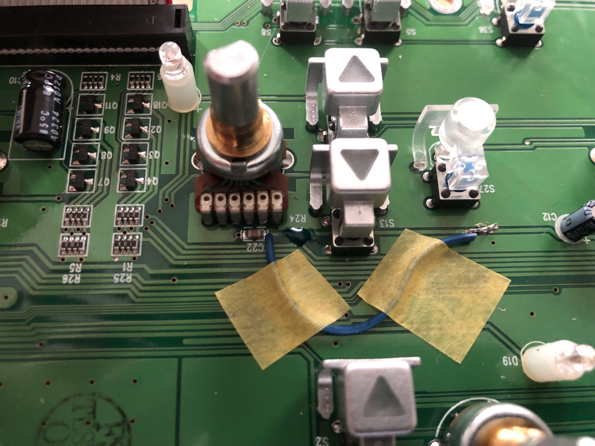 During the replacement of 17 four-pin tacts, my needle nose pliers slipped and murdered a trace on the top of the left panel PCB. I successfully repaired this with a jump. You can see this in photo 24. Note, the jump has since been shored up by coating the bare metal on the right side with green PCB resin (cured in UV light). The curve in the jump was also secured with a nice blob of PCB resin. Thus, this is a solid repair that's going to last.