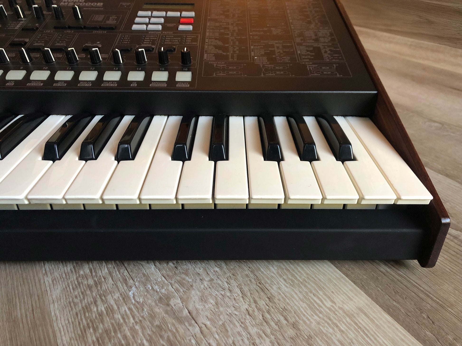 All keys, knobs, and buttons have been whitened. While not perfect, they look nice overall. The translucent patch / sequencer buttons still show some yellowing, as translucent plastic is impossible to fully whiten. The keys are not getting any whiter than they are now. See photo 23 for an example of how a brand-new B key looks compared to these keys. New key not included, just shown for example.
