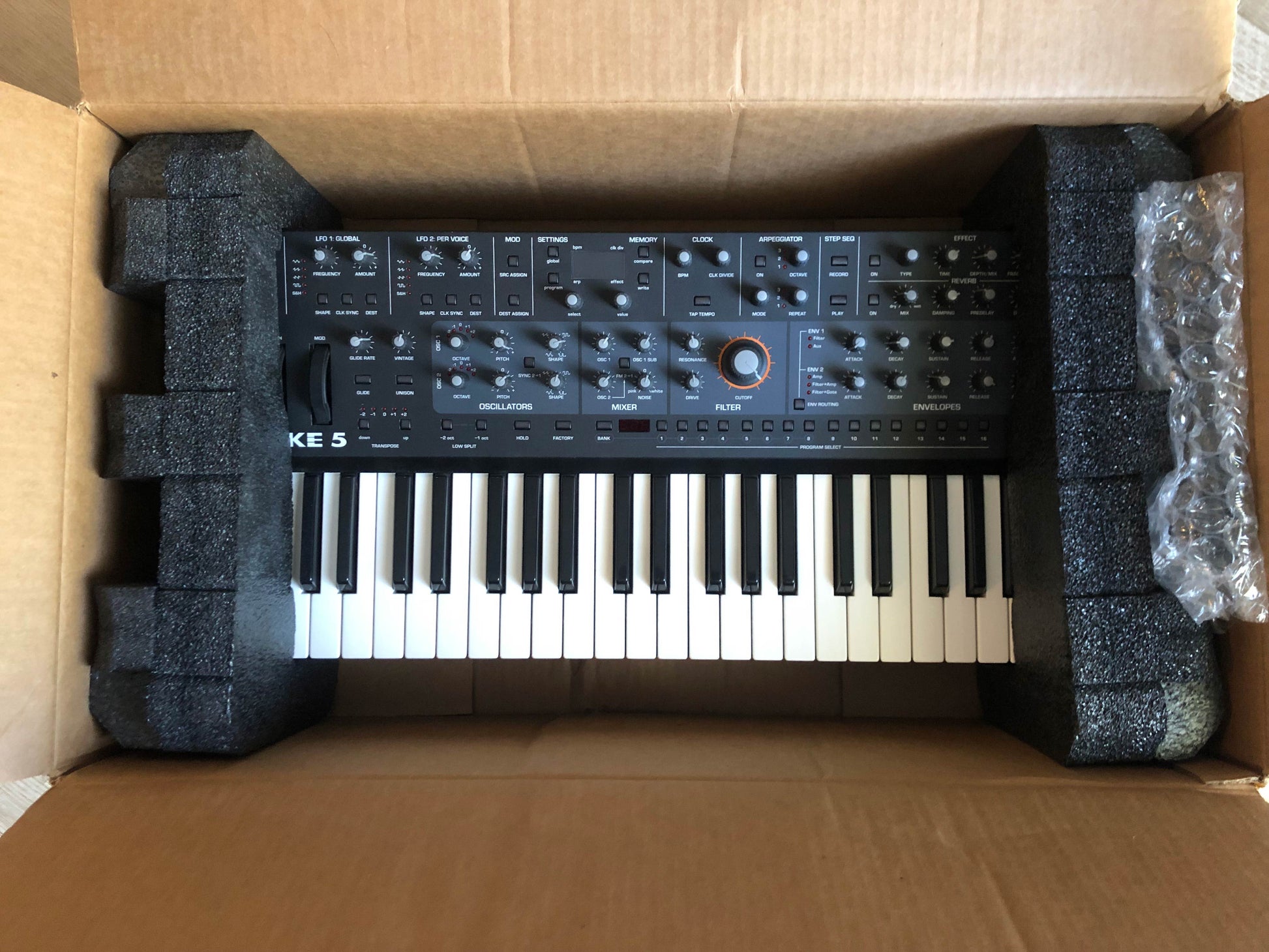 For sale: Sequential Take 5 compact polyphonic analog synthesizer with original box in excellent condition. This lightly used unit has been well taken care of. The only issue of note is some very minor wear on some of the knobs. Overall a nice and clean unit in perfect working order. The box includes the original foam inserts. One of the foam inserts is missing a column and has been supplemented with bubble wrap for safe shipping and transport (see photo 14).
