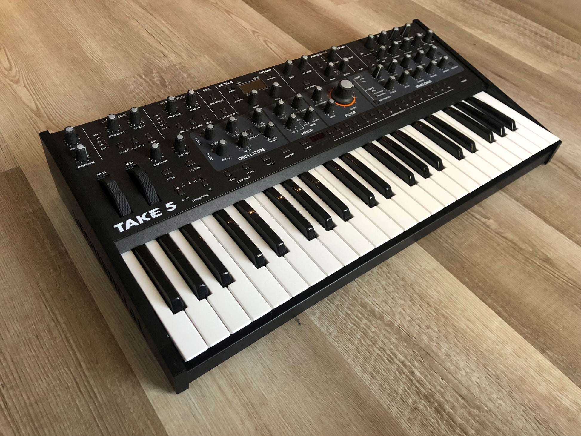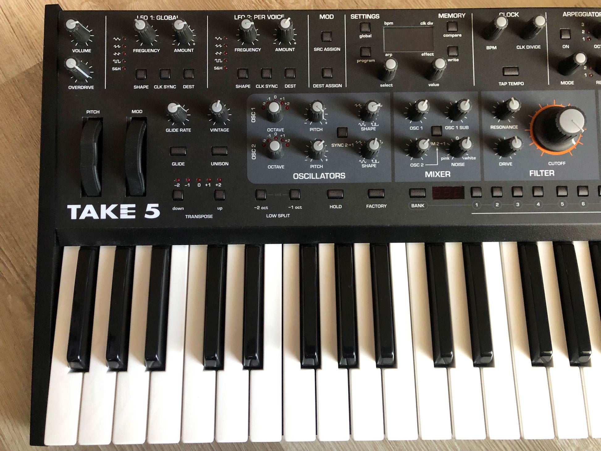 - Polyphony: 5 voices with selectable polyphonic, monophonic, and unison modes for stacked analog sounds